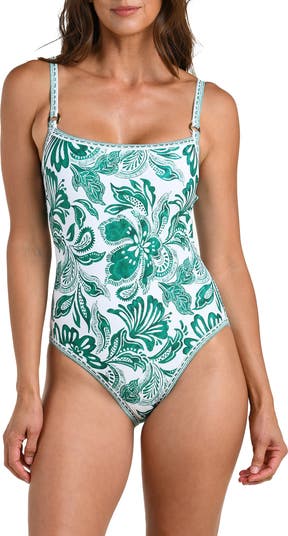 A vacay-ready print pops against the light background of this supportive one-piece swimsuit with a shaping fit.