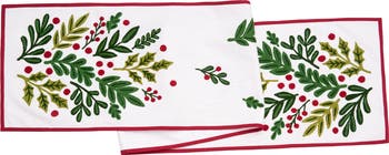 Make your festivities merry and bright with this Botanical Christmas table runner. It's tufted with a white background and a cheerful pattern of diverse and abstract botanical leafy greens and fruity berries throughout the runner, finished with a festive red trim. Bring on the holiday jollies and cheers, and rise your glass.