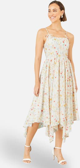 This light and airy dress features a soft scattered meadow-inspired floral print in gentle pastel hues. Designed with slender adjustable straps and subtle tie details at the shoulders, it flows into a relaxed, handkerchief-style hem that adds movement and charm. The softly gathered waist creates an easy, flattering silhouette perfect for warm, sunny days.