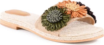 Dimensional flowers make a cheerful statement on this boho-chic slide sandal featuring a woven jute strap.