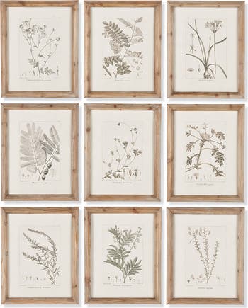 In a soft sepia tone, this set of nine botanicals is an elegant way to dress the wall. Finished off with simple whitewash wood frames, it adds an understated beauty to any setting.