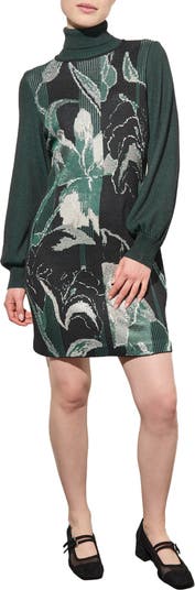 Bring the beauty of the tropics to your cool-weather looks in this jacquard-knit sweater-dress that has a cozy turtleneck and voluminous balloon sleeves.