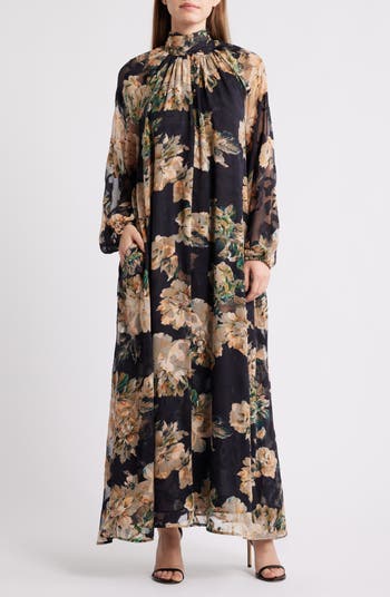 Draping softly from shirring at the shoulders, this breezy maxi dress features a tie detail at the neck that balances the billowy silhouette. Balloon sleeves complement the relaxed shape and a botanical patchwork prints adds color and dimension.