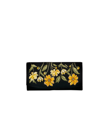 Wander through sun-drenched summer fields with our Black Botanical Velvet Embroidered Purse. Hand-embroidered in radiant yellow blooms upon sumptuous velvet, it evokes the charm of a garden in full flourish. Finished with delicate gold hardware, this little treasure brings a touch of elegance and nostalgia to your evening ensembles.