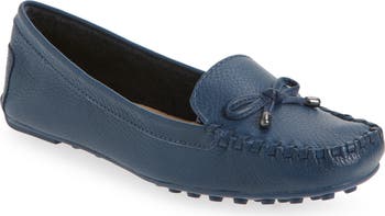 A nubby grip sole underscores the driver inspiration behind this flexible leather loafer fronted by a moc toe and tied up with a bow.