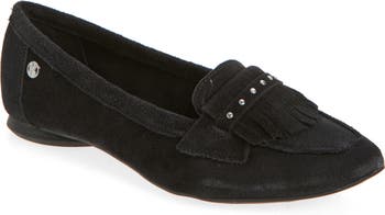 A kiltie vamp and stream of studs enrich the texture and gleam of this supple suede flat fronted by a pointy toe.