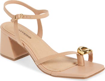 Organically-shaped hardware illuminates the toe ring on a strappy sandal set on a flared block heel and secured with an adjustable buckle closure.