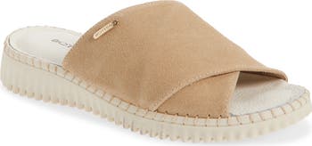 Wide, crisscrossing straps bring subtle dimension to a Brazilian-made slide sandal shaped from supple suede and grounded by a flexible platform sole.