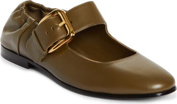 The label's iconic intrecciato weave details the counter of a calfskin flat crafted in a mary jane silhouette secured with an oversized buckle.