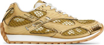 Sporty mesh panels and futuristic cutouts blast this athletic sneaker into the style stratosphere with a heavily grooved sole and streamlined branding.