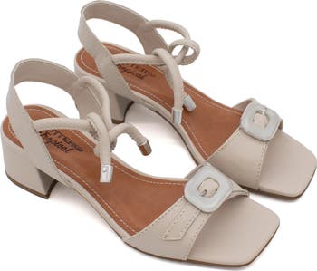 A front buckle strap and ankle tie put a playful twist on this summery leather sandal that keeps steps comfortable with a cushioned footbed and low block heel.
