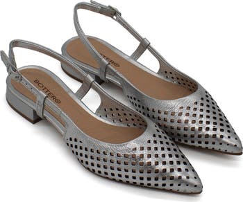 Geometric perforations and a pointy toe bring distinctive elements to a slingback pump rendered in supple leather and set on a barely-there block heel.