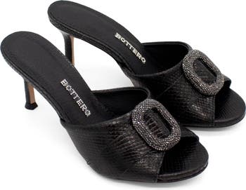A jewel-encrusted buckle glints against the embossed leather upper of a soirée-ready slide sandal lofted by a tapered heel.