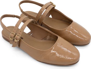 Mary jane and slingback straps maximize the modern delight of this glossy patent-leather flat.