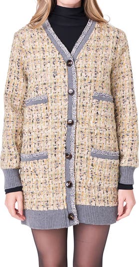Contrast trim plays up the cozy-chic vibes of this textured bouclé coat in a slightly oversized fit.