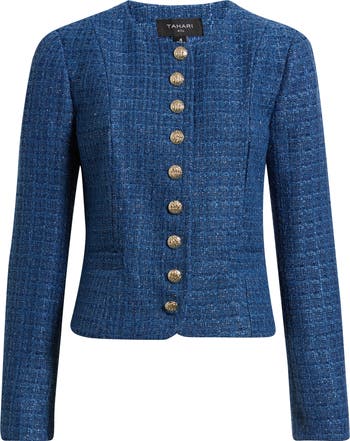 Embossed golden buttons add high-shine contrast to this tailored and textured bouclé jacket.