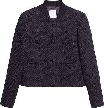An intriguing blend of polished and laid back, this bouclé-knit jacket features a classic four-pocket blazer front counterbalanced by a bomber silhouette and blade collar.