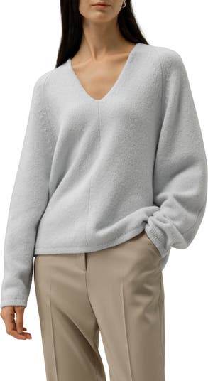 - Bouclé texture, V-neckline, semi-raglan sleeves for a modern twist