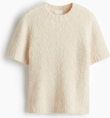 Fitted, short-sleeved T-shirt in a soft bouclé knit containing some wool. Ribbing around the neckline, cuffs and hem.