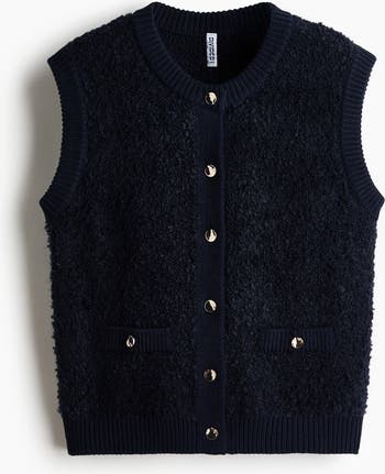 Waistcoat in a soft bouclé knit with a round, ribbed neckline and ribbed fake pockets with a decorative button at the front. Ribbing around the armholes and at the hem.