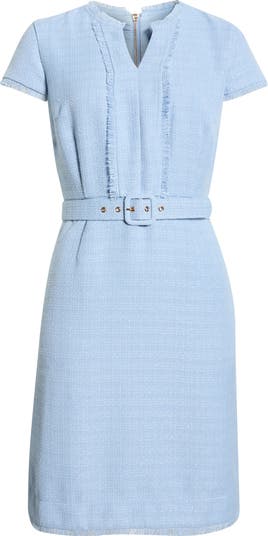 A belted sheath dress gets an elevated update in textural windowpane-check bouclé with fringe along the placket, sleeves and hem.