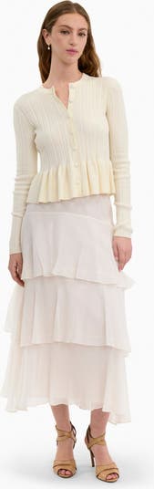 A feminine long sleeve cardigan crafted in soft bouclé with an allover ribbed texture. Designed with delicate covered buttons and a subtle peplum hem, it creates a flattering, waist-defining silhouette. Style it with your favorite summer dress look or pair it with denim for elevated everyday dressing.