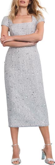 Bouclé dress in a midi silhouette featuring a square neckline, cap sleeves, sequin embellishment, rear split with a zip fastening through the back. Fully lined.