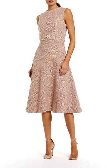 Soft bouclé brings rich texture to this sleeveless button-up midi dress, offering a timeless silhouette with modern polish and effortlessly elevated appeal.