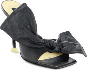 A prominent asymmetric bow and jewel-inspired faceted heel cap enhance the standout look of a runway-featured slide sandal done in supple lambskin leather.