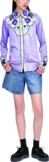 Western charm meets feminine flair—this satin cowboy shirt features stunning floral and butterfly embroidery with classic snap button closures.