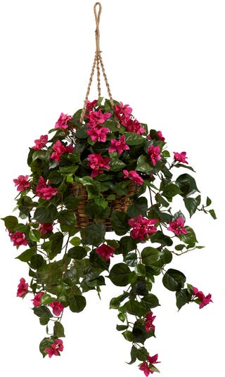 Here's our perfect silk recreation of the wonderful Bougainvillea plant, in a gorgeous hanging basket. The fluffy leaves and blooms of the Bougainvillea burst out of the basket, and then gently cascade downward to give a look that has to be seen to be believed. Plus, this silk beauty will never need a drop of water, so you can hang it anywhere. Buy one for your home, and one as a gift for that hard to please person.