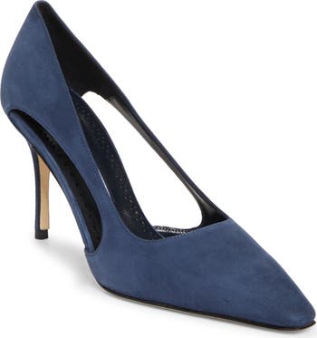 Airy side cutouts bring warm-weather appeal to a calfskin-suede pump designed with a snipped pointy toe and willowy stiletto heel.