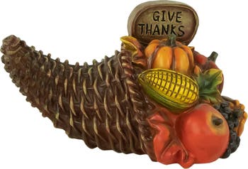 Celebrate the beauty and abundance of fall with this tabletop cornucopia decoration. Overflowing with autumnal tones of brown, orange, yellow, and red, this timeless centerpiece captures the spirit of Thanksgiving with its warm, inviting design. The detailed cornucopia for Thanksgiving is artfully filled with faux pumpkins, leaves, berries, and gourds, symbolizing prosperity and gratitude. A “Give Thanks” sign adds a meaningful touch, making it a beautiful reminder of the season’s message. Crafted to showcase natural textures and vibrant hues, this cornucopia Thanksgiving decoration serves as an eye-catching focal point for your dining table, mantel, or entryway display. Its lifelike design blends seamlessly with both traditional and modern décor styles, creating an atmosphere of warmth and togetherness during the holiday season. Made from long-lasting materials, this decorative cornucopia can be enjoyed year after year as part of your Thanksgiving decor or autumn collection. Whether displayed on its own or paired with candles, table runners, or wreaths, it captures the cozy feeling of fall gatherings. Embrace the essence of gratitude with this fall cornucopia tabletop accent, an ideal way to express the joy and abundance of the Thanksgiving season. Product Features: Filled with classic Autumn produce Designed in traditional Fall hues Adorned with a "Give Thanks" sign Flat bottom for easy tabletop display Recommended for indoor use only Dimensions: 4.5"H x 8.5"W x 4.25"D Material(s): polyresin