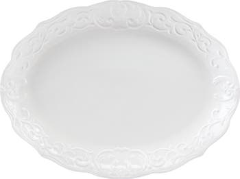 No major dinner gathering is complete without the Gibson Home Bountiful Joy Durastone Oval Platter placed at the center of the table. Its lavish 18.75 x 14 inch size is perfect for any extravagant main dish. The rim is decorated with a Versailles style embossed pattern. The white gloss finish helps exaggerate any colorful meal to draw guests in. The strong durastone material allows for the platter to be dishwasher safe and microwave safe for better everyday convenience. Serve a variety of meals, from a savory lechon, to a large display of juicy steaks!