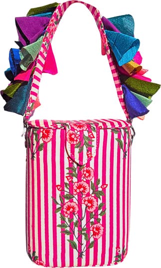 The bucket bag that feels like a stroll through a flower market. The Bouquet Bazaar Bag features candy-pink vertical stripes and an embroidered floral bouquet that blooms right down the center—bold, playful, and unmistakably Simitri.
