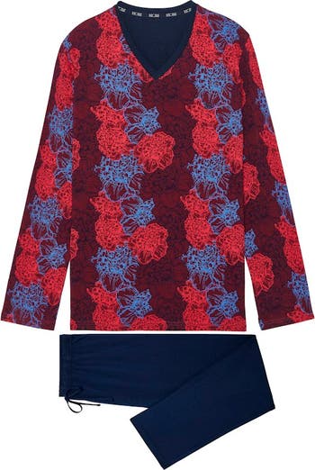 - Made from 100% cotton, they offer a pleasantly soft feel","2-piece set: made up of flowing, straight-leg pants in plain navy blue and a long-sleeved V-neck tee-shirt","Top is adorned with a multicolored rose motif ","Top features genuine HOM logo embroidery and a patch pocket on the chest","Imported