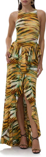 Ruffle trim and a dramatic side slit energize the look of this sleeveless dress patterned in stunning tiger stripes.