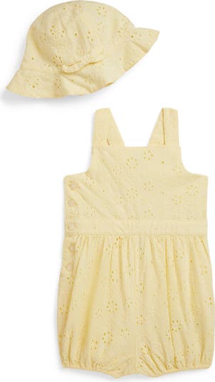 Baby will be ready for sunny days and playdates in this matching broderie-anglaise set featuring a bubble romper with a cutout and a matching sun hat, both made with little bows.