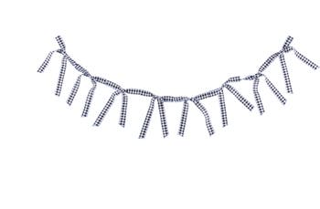 Hand-tied ribbon garland in classic black-and-white gingham with sky blue edges. Adds a simple, cheerful touch to any space.