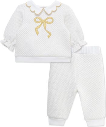 A large bow and scalloped edges lend a coquettish vibe to a top and joggers set that has baby looking oh-so-sweet and trendy.