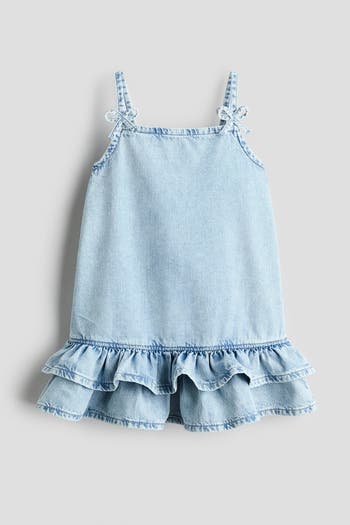 Dress in washed cotton denim. Narrow shoulder straps with attached bow at front, square neckline, and a gathered seam above wide flounces at hem for added volume. Unlined.