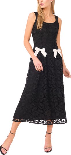 Lacy blooms and satin bows define a party-ready dress cut to a beloved and versatile midi length.