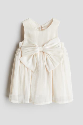 Dress in sheer organza featuring a large, satin-trimmed bow. Round neckline, buttons at the back and gathers at the waist with a voluminous skirt. Satin lining.