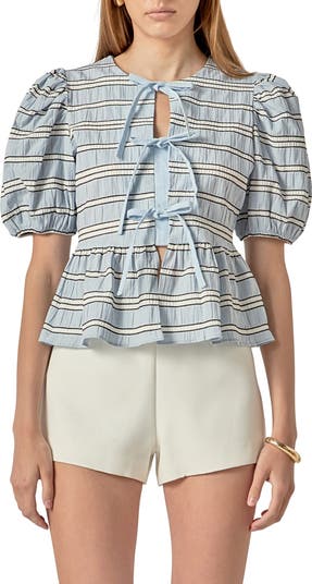Dainty bows tether the front of this crinkled cotton top framed by delightful puff sleeves and a flouncy peplum.