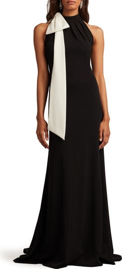 A flourishing bow and a puddling hemline add glamorous style points to a head-turning gown rendered in beloved black-and-white.