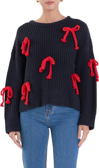 Braided ribbons sweeten this textured sweater knit with dropped shoulders for a slouchy fit.