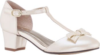 Perfect for special occasions or parties, this shimmering kid-sized pump set on a walkable block heel features a sparkly bow highlighting the T-strap. A memory foam cushioned footbed offers dance-all-night comfort.