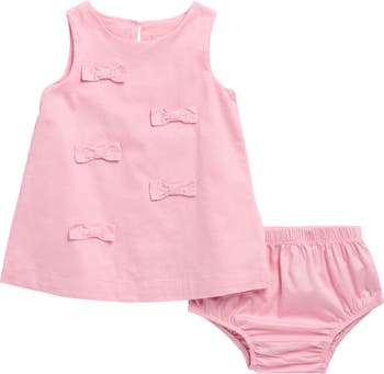 Crisp cotton poplin keeps your little one feeling breezy as they giggle in this shift dress featuring tonal bows and matching bloomers.