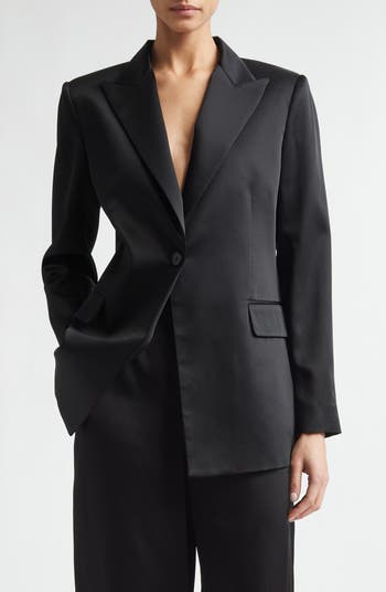 A kiss of Italian silk soften a glossy single-button blazer tailored to perfection.