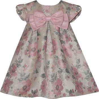 A darling bow adds to the sweetness of a petal-sleeve party dress that's covered in jacquard blooms illuminated by metallic threads.